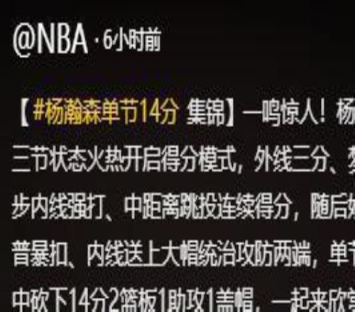 而NBA的官方账号也对杨瀚森送上祝贺,称赞他的表现是“一鸣惊人”“梦幻脚步!