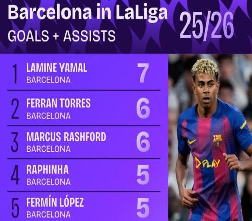 赛后根据Squawka的统计,巴萨是本赛季至今欧洲五大联赛中唯一一支有5名球员至少参与5粒联赛进球的球队,目前亚马尔为巴萨在西甲贡献了3球4助攻、费兰-托雷斯5球1助攻、拉什福德2球4助攻、拉菲尼亚3球2助攻,费尔明-洛佩斯3球2助攻。
