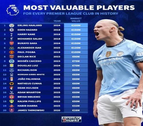本赛季英超各队历史身价最高球员:哈兰德第1,4人1.5亿第2