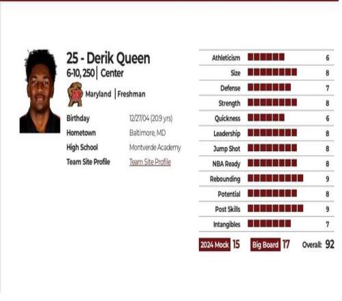 在马里兰大学他打出了非常出色的数据表现,场均出场30分钟得到16.5分、9篮板、1.9助攻、1.1盖帽、1.1抢断数据,另外值得一提的是他的数据含金量非常高,因为马里兰大学所在的BIG10联盟可以说是美国NCAA的最强赛区之一,区内有包括密歇根州大学、密歇根州立大学、普度大学、UCLA大学、威斯康星州大学、伊利诺伊州大学、俄勒冈州大学等多所NCAA 顶级篮球名校,每年的竞争极其激烈,奎因大一赛季带领学校取得25胜8负战绩排名赛区第二,在疯狂三月杀进甜蜜十六强,他个人获得赛区最佳新秀、入选赛区最佳阵容。