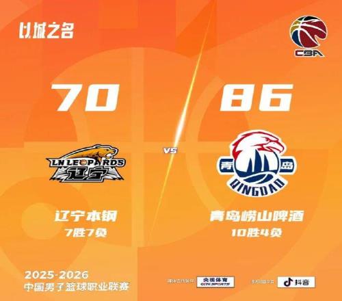 2026年1月13日,2025-2026赛季CBA联赛常规赛第14轮,青岛崂山啤酒客场对阵辽宁本钢。上半场双方你来我往、紧咬比分,易边再战青岛崂山啤酒多点开花建立两位数领先,末节稳扎稳打占据场上主动,吕俊虎手感火热,拿到21分5记三分球,最终86-70战胜对手,收获两连胜。
