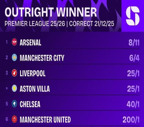 英超夺冠赔率:阿森纳、曼城前二,维拉升至并列第三 -